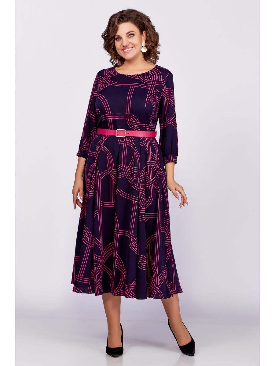 Платье из мягкой, струящейся вискозной ткани, Х-образного силуэта с полуприлегающим лифом. Платье отрезное по линии талии. По переду лифа расположены рельефы, по спинке лифа талиевые выточки. Юбка расклешенная из шести клиньев со встречными складками по линии талии. В среднем шве спинки предусмотрена молния. Рукав втачной длиной ¾, по низу манжета с эластичной вставкой.