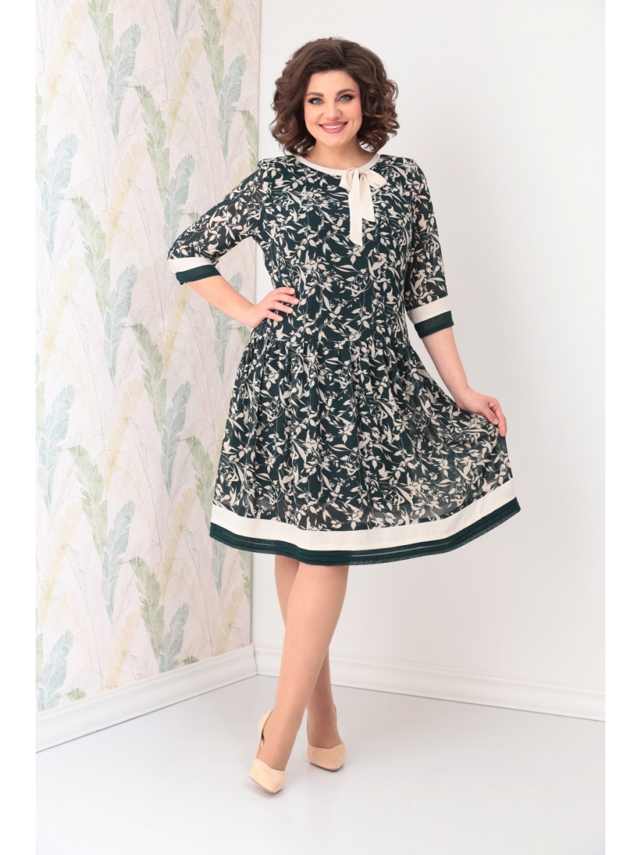 Платье женское, свободного силуэта из шифона на трикотажной подкладке. Рукава втачные, ниже уровня локтя, по низу пришиты манжеты из 2-х видов ткани, по манжетам застрочены горизонтальные складки. По платью ниже линии талии выполнен подрез, нижняя часть со сборкой, по низу пришита отделочная деталь с 3-мя складками из 2-х видов ткани. Горловина обработана планкой из однотонной ткани, по переду горловины пришит заготовленный бантик с украшением.