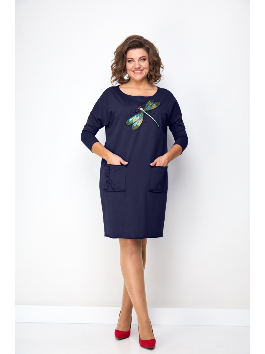 Платье женское в спортивном стиле из трикотажного полотна. Перед платья украшен вышевкой. Горловина обработана обтачкой. По переду накладные карманы. Рукава втачные, спущенные.