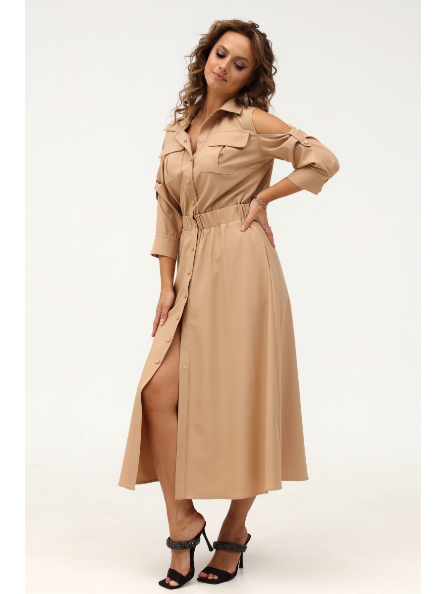 Платье полуприлегающего силуэта, расклешенное книзу. Воротник отложной, на притачной стойке. Платье отрезное по линии талии, на широкой резинке. Платье с центральной застежкой на кнопки на притачных планках. Полочка с нагрудными вытачками и накладными карманами со складкой и клапаном. В боковых швах юбки функциональные карманы. Рукав втачной длинной 3/4, с открытым плечом и декоративной патой на кнопке, понизу - широкая притачная манжета с застежкой на кнопки.