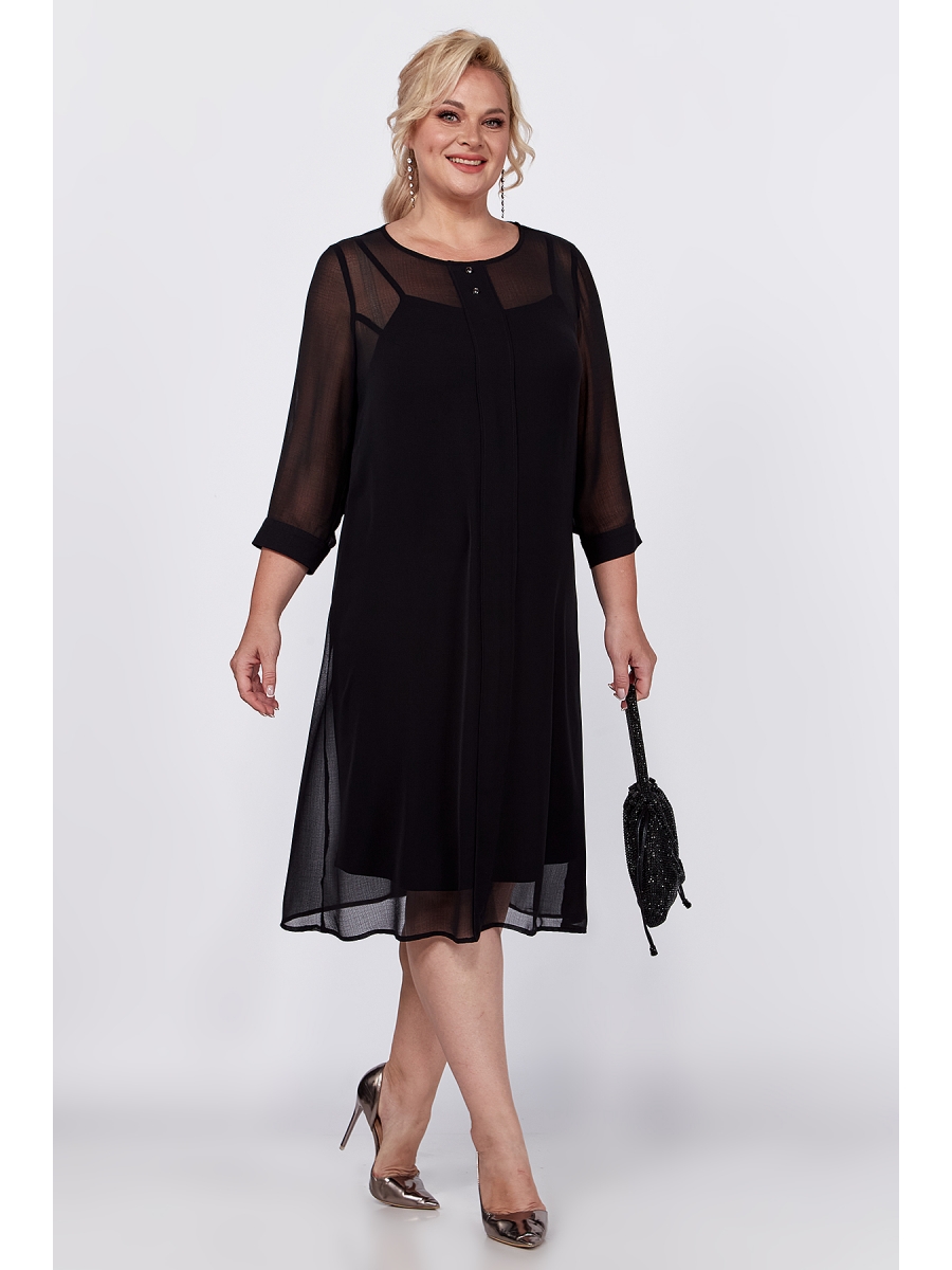 Универсальное, элегантное черное платье с рукавом длиной ¾ на манжете и отдельным подкладом поможет Вам в создании абсолютно разных образов. Платье имеет классический прямой крой с бантовыми складками по переду и по спинке, которые добавляют романтичность и элегантность. Платье подойдет как высоким, так и невысоким женщинам, благодаря своей миди длине. Верхнее платье выполнено из шифона, горловина декорирована пуговицами. Нижнее платье на бретелях пошито из ткани "масло". Это платье Вы можете легко использовать как платье вечернее, как платье для прогулки или на свидание, на день рождения или клуб, для фотосессии или романтического вечера.