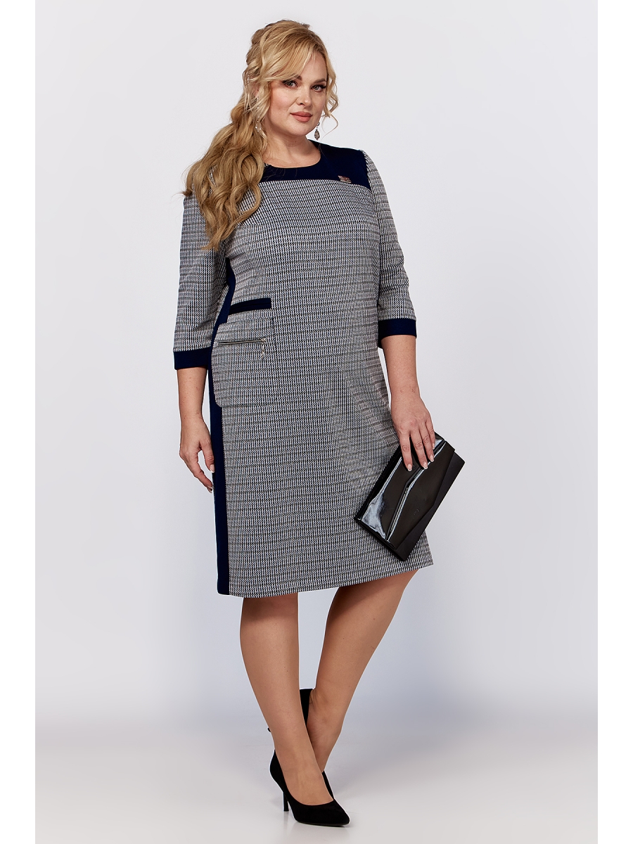 Женское платье прямого силуэта, скомбинированное из двух видов трикотажного полотна - однотонного и цветного. На полочке обработан накладной карман с молнией. Рукав длиной 7/8, втачной, одношовный, заканчивается манжетой. Спинка со средним швом. Изюминкой данной модели являются бочки, кокетка и имитация прорезного кармана из контрастной однотонной ткани. Фасон интересен тем, что модельные линии как нельзя лучше подчеркивают плавные изгибы женской фигуры. В данной модели платья Вам не скрыться от неравнодушных взглядов противоположного пола. Оно станет отличным выбором осенью и зимой для офиса, для праздника, на каждый день, а также для прогулок. Платье подойдет как для высоких, так и для невысоких девушек и женщин. Такой стильный наряд для полных станет любимой вещью в гардеробе и сделает Ваш образ незабываемым!