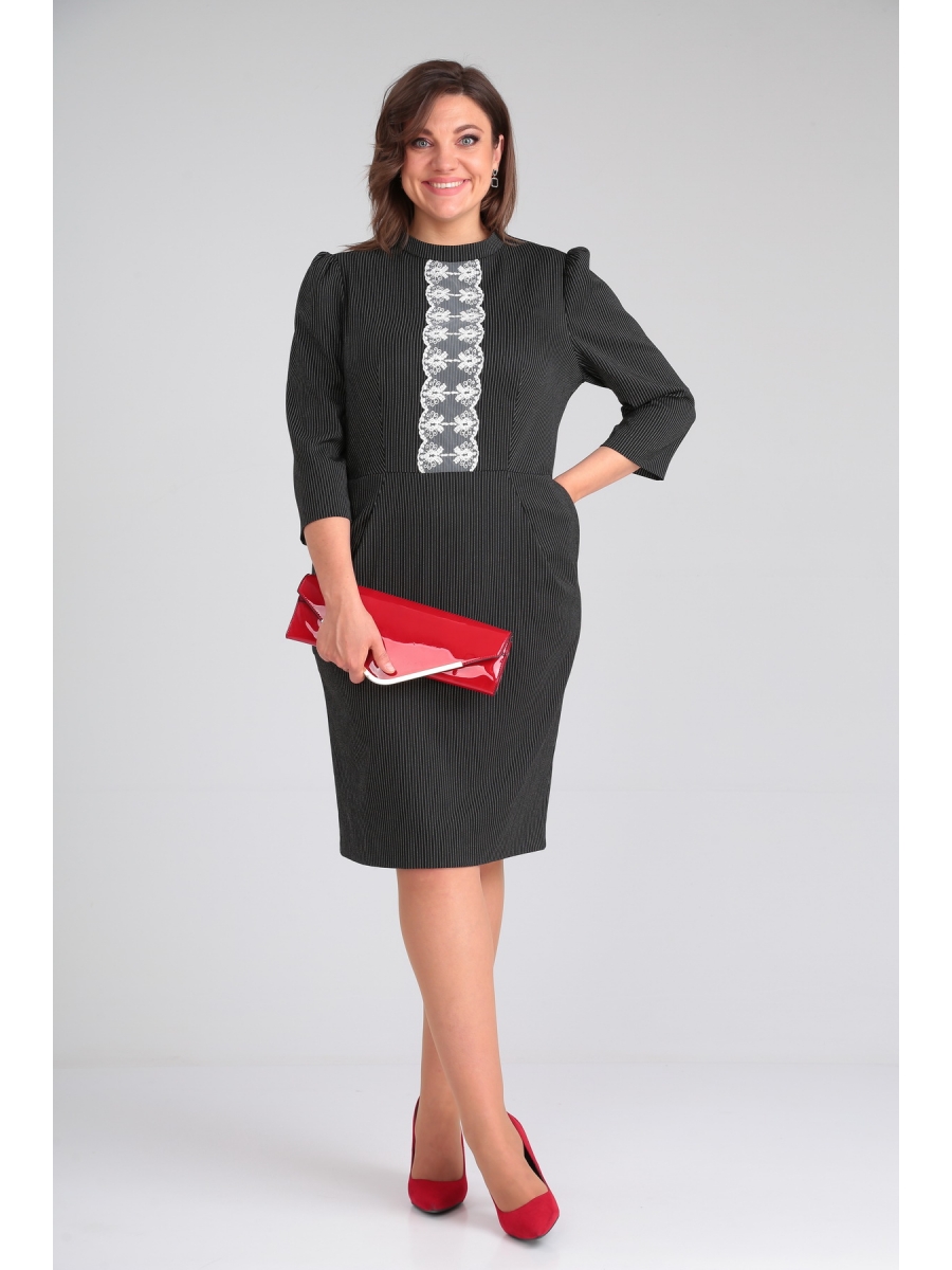 Элегантное женское платье полуприлегающего силуэта, выполненное из костюмно-плательной ткани в тонкую полоску (тянется). Перед отрезной по линии талии. По лифу переда талиевые вытачки и настрочное отделочное кружево. По нижней части переда заложены складки, на уровне бедер – наклонные карманы с отрезными бочками. Горловина оформлена стойкой. Спинка с центральным швом и талиевыми вытачками. Застежка на тесьму-молнию в среднем шве спинки. Рукава втачные, одношовные, присборенные по окату.