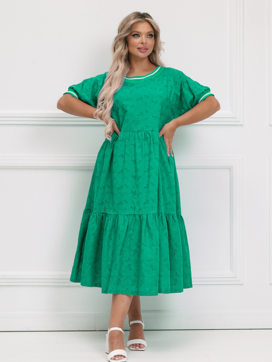 Очаровательное платье свободного силуэта из текстильной ткани (хлопок с вышивкой) зеленого цвета. Круглый вырез изделия и цельнокроеные рукава обработаны вязаными манжетами. Платье отрезное, линия талии завышена. Юбка изделия состоит из широких оборок. Длина изделия от плечевого шва по спинке до низа изделия — 117 см.