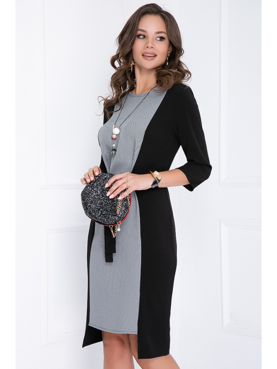 Райзела – платье прямого силуэта из костюмной ткани. Комбинировано декоративной вставкой по переду. Изюминкой данной модели является декоративный пояс который создает идеальный силуэт и делает вашу фигуру стройнее. Рукав 3/4 прямой, втачной. Ворот круглый. Платье имеет разную длину сзади и спереди. Будьте стильной и неподражаемой вместе с “Белловера”!