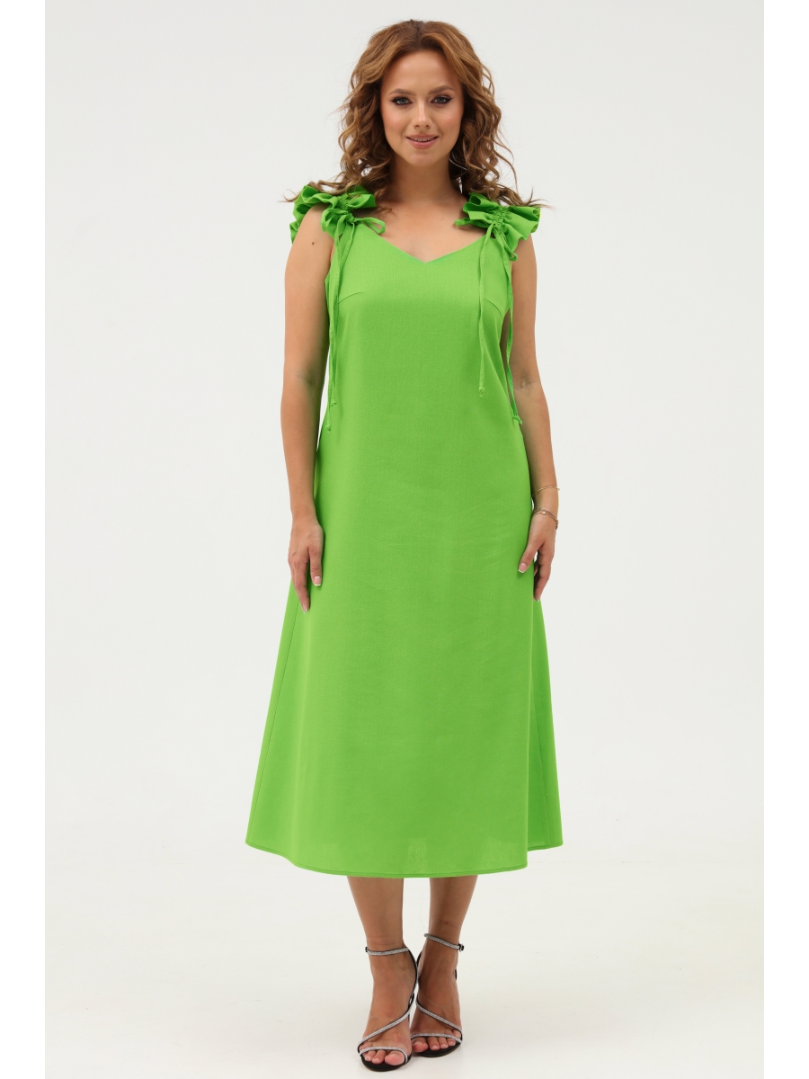 Платье полуприлегающее А-силуэта с тонкими бретелями на завязках. Горловина по переду V-образной формы. По переду нагрудные вытачки, а спинка - с рельефами. Застежка на потайную молнию в боковом шве.