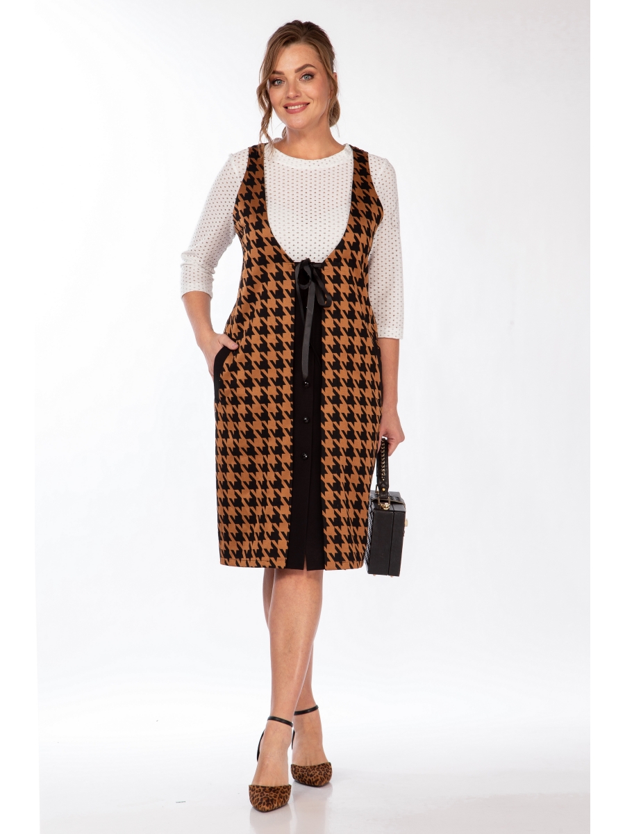 Сарафан женский полуприлегающего силуэта, выполнен из трикотажной ткани в крупный рисунок гусиная лапка, центрально-бортовая застежка на петли и пуговицы. Перед украшен отрезными контрастными планками и карманами.