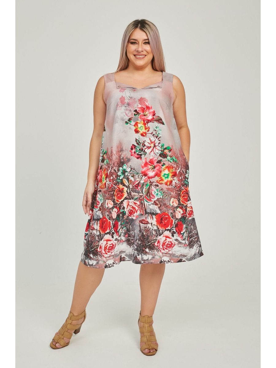 Летний сарафан, свободного силуэта на широких бретелях, из штапельной ткани с ярким купонным принтом цветы. Прилегание по груди за счет вытачек. Фигурный вырез горловины оригинально дополнен отложными уголками с фиксацией на пуговицу. В боковых швах удобные карманы, низ ровный. Комфортная модель для повседневного летнего образа
