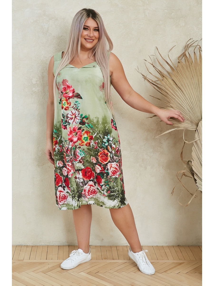 Летний сарафан, свободного силуэта на широких бретелях, из штапельной ткани с ярким купонным принтом цветы. Прилегание по груди за счет вытачек. Фигурный вырез горловины оригинально дополнен отложными уголками с фиксацией на пуговицу. В боковых швах удобные карманы, низ ровный. Комфортная модель для повседневного летнего образа