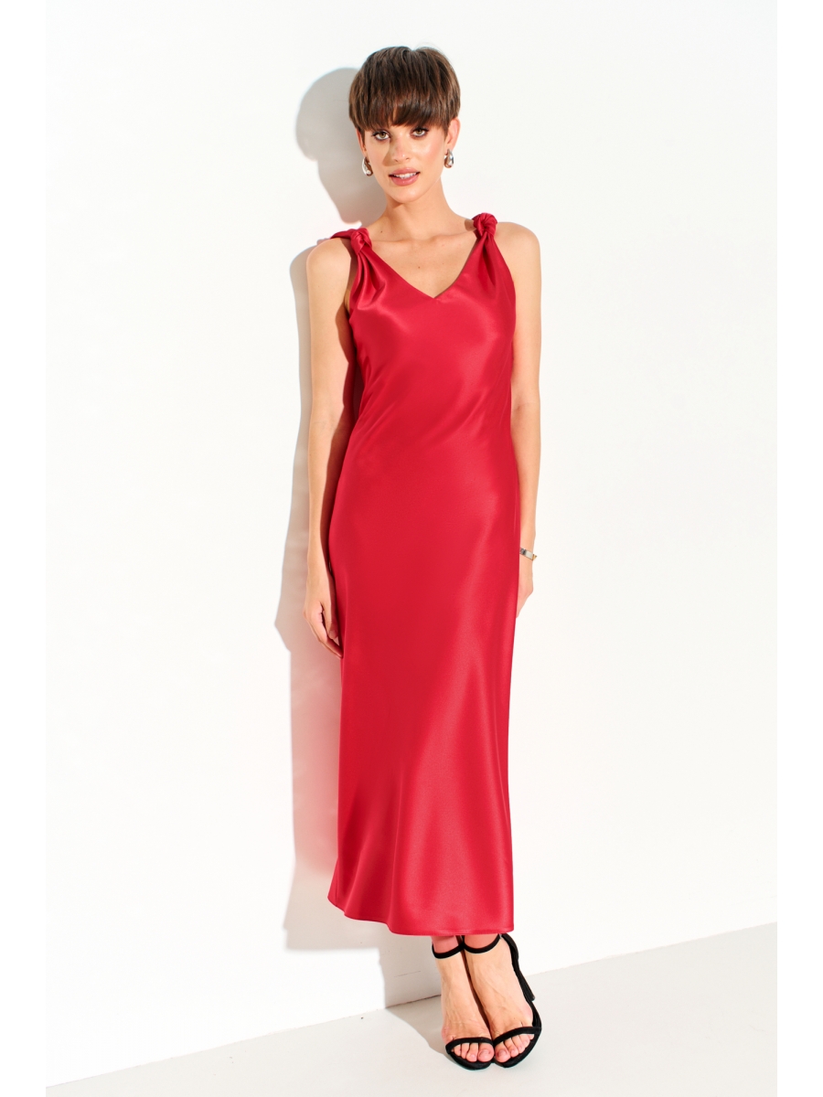 Платье-комбинация длины миди полуприлегающего силуэта выполнено из струящегося шелк - сатина с декоративными регулирующими узлами, в боковой шов вставлена потайная молния.