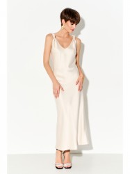 Платье-комбинация длины миди полуприлегающего силуэта выполнено из струящегося шелк - сатина с декоративными регулирующими узлами, в боковой шов вставлена потайная молния.