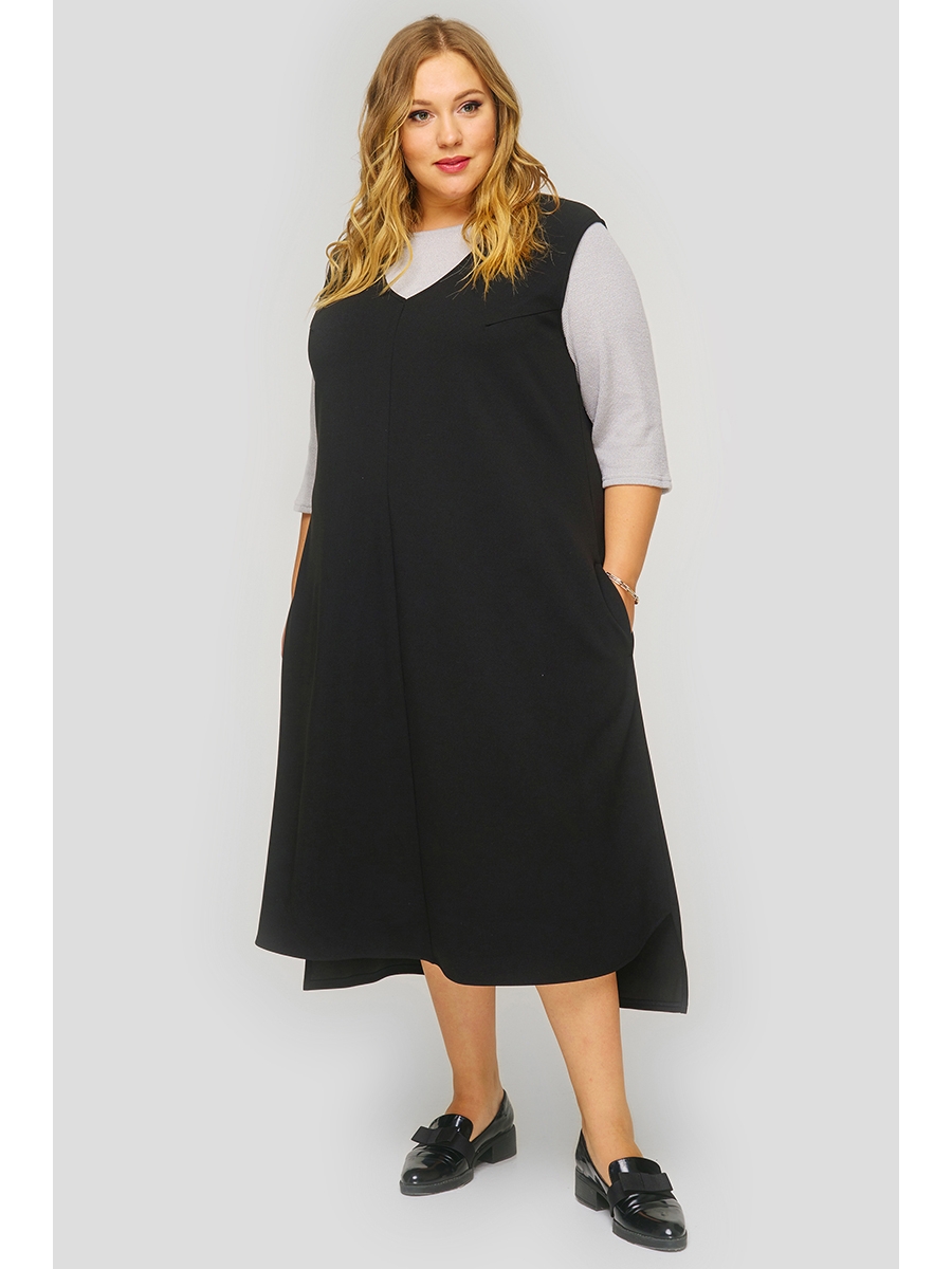 Сарафан полуприлегающего силуэта, с V-вырезом горловины. В боковых швах карманы. Линия низа по переду закруглена на уровне боковых швов, по спинке - прямые углы. Спинка длиннее переда на 7см.