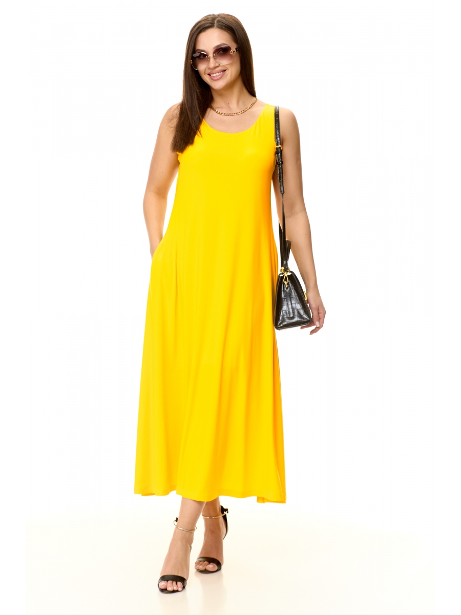 Стильный, элегантный, красивый, с прекрасной посадкой, женский сарафан из трикотажной ткани хорошего качества "масло". Сарафан с глубоким вырезом как спереди, так и сзади, на подкладке из той же ткани, что подчеркивает насыщенность цвета. По вырезу рукав сбоку переходит в кокетку,что придает элегантность и удобство при носке. По бокам функциональные карманы. Сарафан полуприлегающего силуэта с хорошим расклешением книзу.