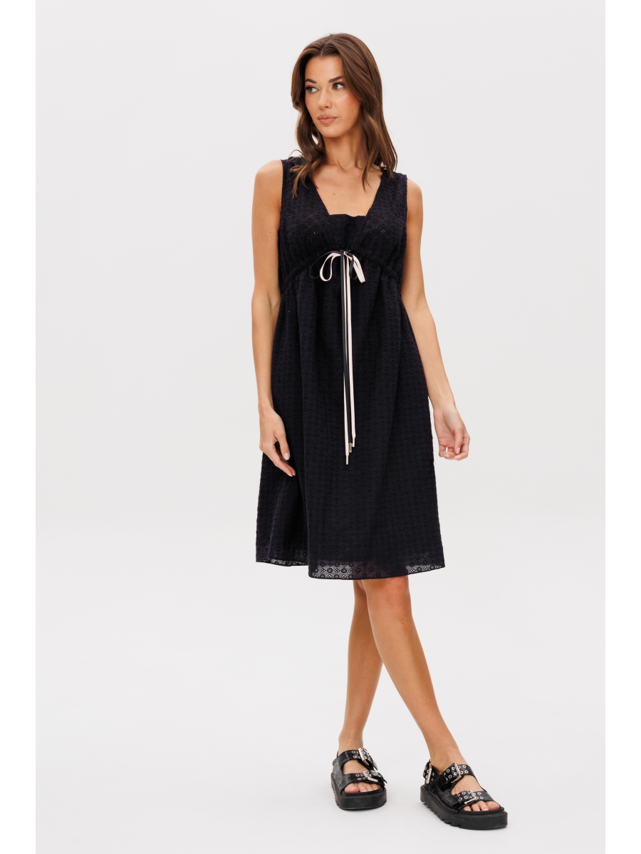 Оформить заказ →Черный цвет всегда в моде. Черный цвет считается таинственным. Он утонченный, мощный и смелый. Интересная фактура полотна с геометрической вышивкой и необычный крой превращают простое платье в модель со знаком +. Свободный А-образный силуэт, изящный покрой выше линии талии, подтягивающаяся кулиса с завязкой и романтичный волан.