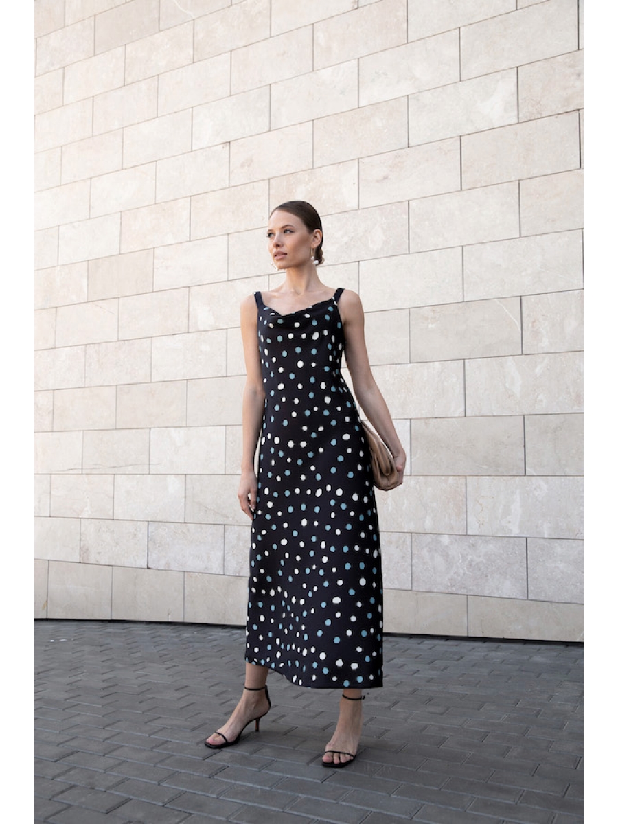 Платье с «качелями» в зоне декольте смотрится очень женственно. Изделие на бретелях полуприлегающего силуэта, расширенное книзу из атласной плательной ткани.