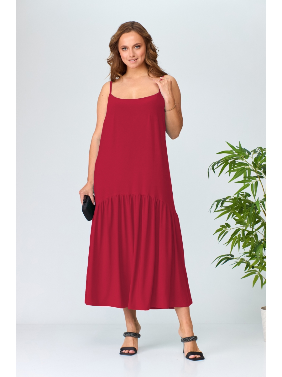 Платье-сарафан из трикотажного полотна, на брителях прямого силуэта, с воланом. Волан фигурный, по полочке идет выше, по спинке ниже. Из боковых швов идут грудовые выточки, брители регулируются.