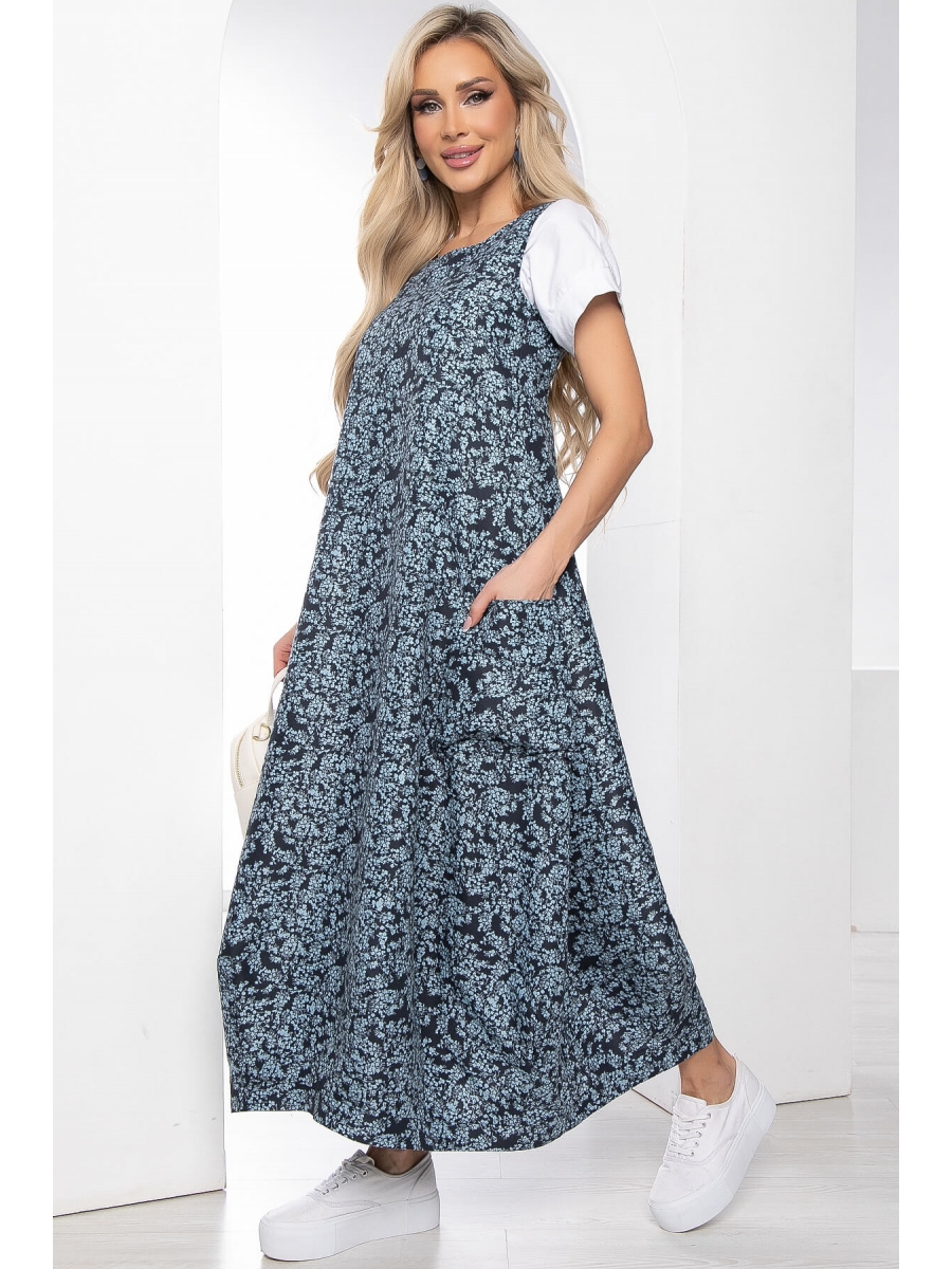 Легкий и свободный сарафан из принтованного штапеля. Модель длинного сарафана с объемным верхом и зауженным низом подходит для женщин любого типа фигуры. Сарафан с глубокими накладными карманами и широкими бретелями отлично будет сочетаться с футболками и тонкими водолазками. Сарафан-бохо идеален для городских прогулок. Хорошо сочетается с белыми кедами и удобными босоножками.