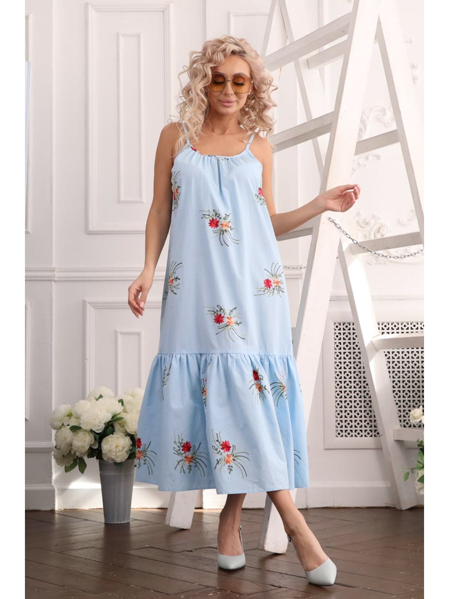 Роскошный сарафан свободного силуэта из текстильной ткани голубого цвета с вышивкой. Круглый вырез изделия обработан окантовкой и дополнен сборкой. Сарафан на бретелях. По низу изделия широкая оборка со сборкой. Спинка изделия дополнена вырезом с завязками.