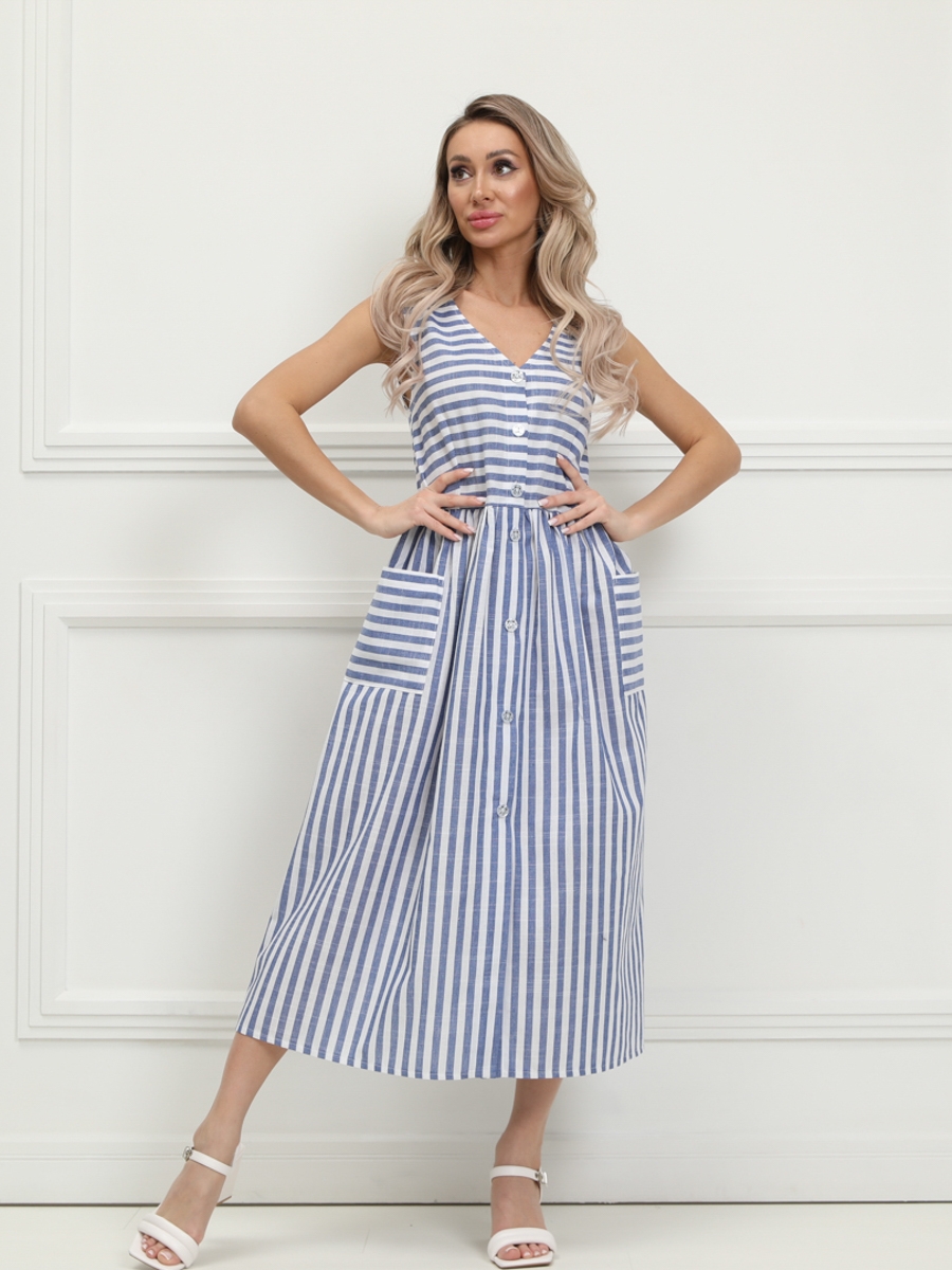 Эффектный сарафан полуприлегающего из текстильной ткани бело-голубого цвета. V-образный вырез и проймы рукавов обработаны окантовкой. По переду изделия выполнена планка с застежкой на пуговицы. Сарафан отрезной, линия талии дополнена сборкой. По переду изделия - накладные карманы. Длина изделия по спинке от плечевого шва до низа изделия — см. Рост фотомодели — 170 см.