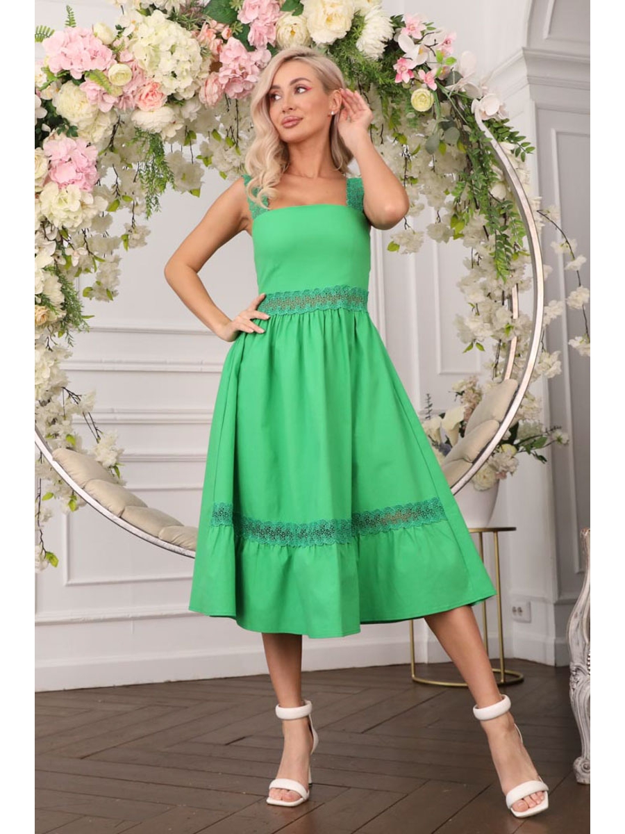 Роскошный сарафан прилегающего силуэта из текстильной ткани зеленого цвета. Бретели выполнены из кружева. Платье отрезное по линии талии, талия эффектно подчеркнута втачным поясом из кружева. Юбка дополнена сборкой и кружевом. По спинке изделия втачная молния. Длина изделия по спинке от плечевого шва до низа изделия - 112 см. Рост фотомодели - 170 см