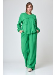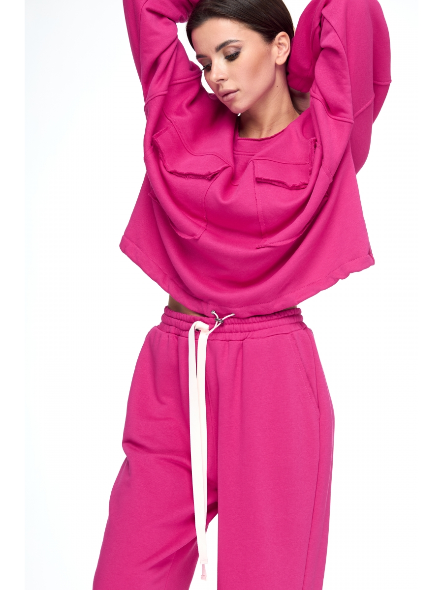 Брюки прямые посадка на талии, на эластичном поясе с резинкой внутри, обработаны боковые карманы. Изюминкой комплекта являются открытые срезы, добавляющие небрежного шика образу. Выполнен в нескольких оттенках.