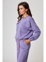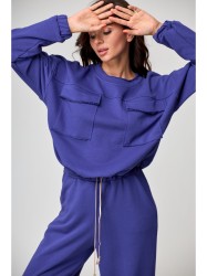 Свитшот объемный, прямого силуэта. На передней части выполнена отрезная кокетка, в шве обработаны накладные карманы с клапанами. Низ свитшота на кулиске, ширину можно регулировать по вашему желанию. Линия плеча удлинённая, рукава длинные, с притачной манжетой на резинке. Горловина обработана бейкой.
