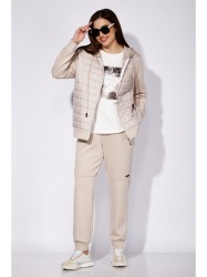Куртка прямого силуэта. Перед и спинка выполнены из двухсторонней, стеганой на синтепоне (W100) плащевки. Карманы в боковых швах. Рукав втачной, длинный, по низу на манжете. Горловина оформлена капюшоном с кулисой. Низ на манжете. Капюшон, рукава, манжета низа и брюк из трикотажного полотна.