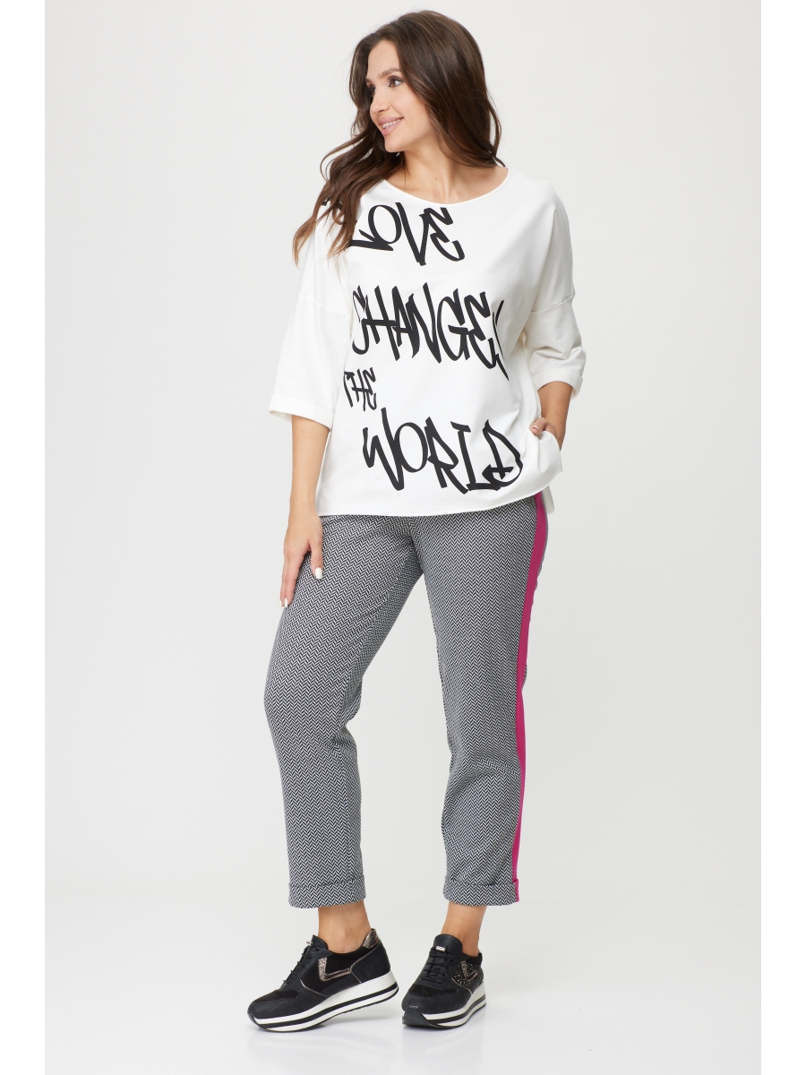 Брюки свободного кроя длиной 7/8, зауженные к низу, по низу брюк цельнокроеная манжета - отворот. По бокам с контрастными лампасами, в боковых швах карманы, пояс на резинке. Оба изделия смело можно сочетать с другими вещами вашего гардероба.