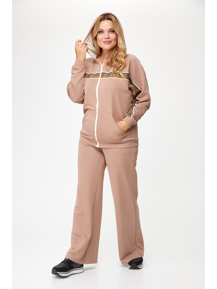 Худи с капюшоном, покроя реглан, длинный рукав на манжете. Перед с центральной застежкой на молнию и карманом кенгуру, спинка цельная, низ худи с притачной планкой. По переду декор в виде настрочной декоративной тесьмы- лампаса от центра полочки с переходом на рукав вдоль манжеты. Внутренная часть капюшона выполнена из контрасной ткани.