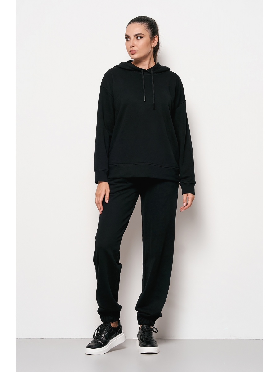 Спортивный женский костюм свободного силуэта, состоящий из худи с капюшоном и брюк, выполнен из высококачественного футера 3-х нитки класса "пенье". Лицевая сторона ткани гладная, изнанка - петлеобразная.