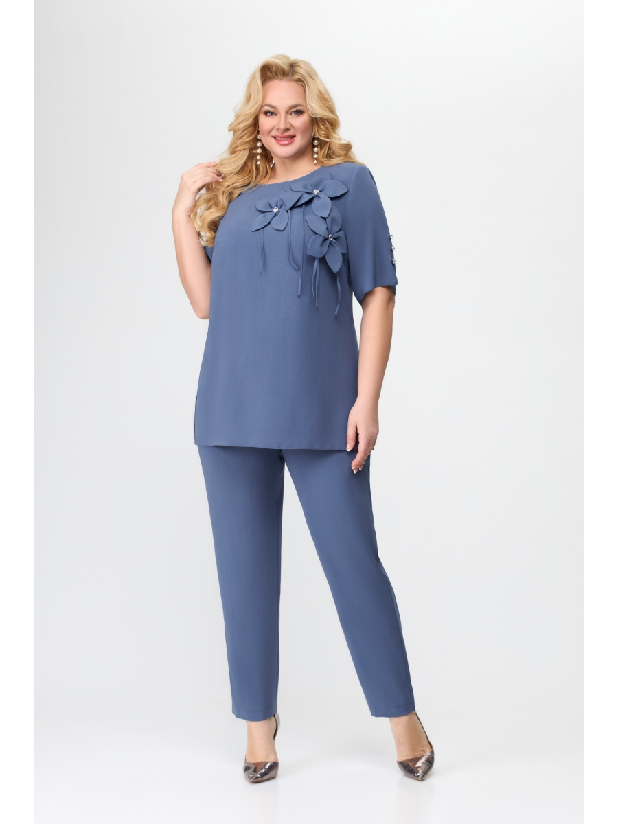Костюм женский двухпредметный состоящий из блузки и брюк. Блузка прямого силуэта с коротким втачным рукавом. По переду блузки украшение из цветов, по линии груди вытачки. Рукав из двух частей с разрезами, и декоративной застежкой. В боковых швах блузки разрезы.