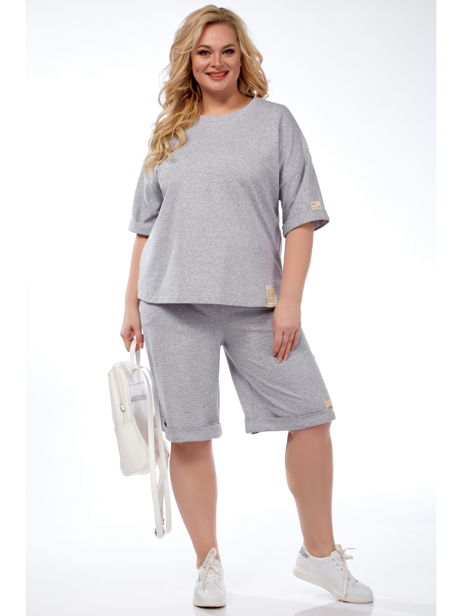 Костюм женский спортивный, состоит из джемпера и шорт. Выполнен из трикотажной ткани. Джемпер свободного силуэта без выточек со спущенным плечом, рукав с притачным манжетом, в боковых швах разрезы. Шорты свободного силуэта ,низ обработан отложным манжетом, пояс на резинке, в боковых швах карманы.