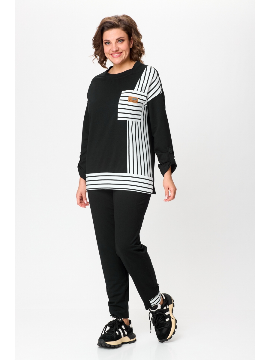 Блузон полуприлегающего силуэта, со спущенной проймой, правая часть переда, карман и планка низа выполнены из трикотажа в полоску. Горловина круглая с планкой, рукава длинные, по низу застегиваются на пату.