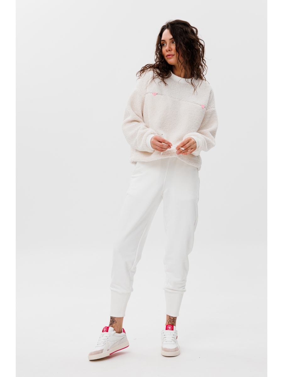 Брюки с боковыми карманами, пояс на резинке, по низу широкие манжеты из кашкорсе.