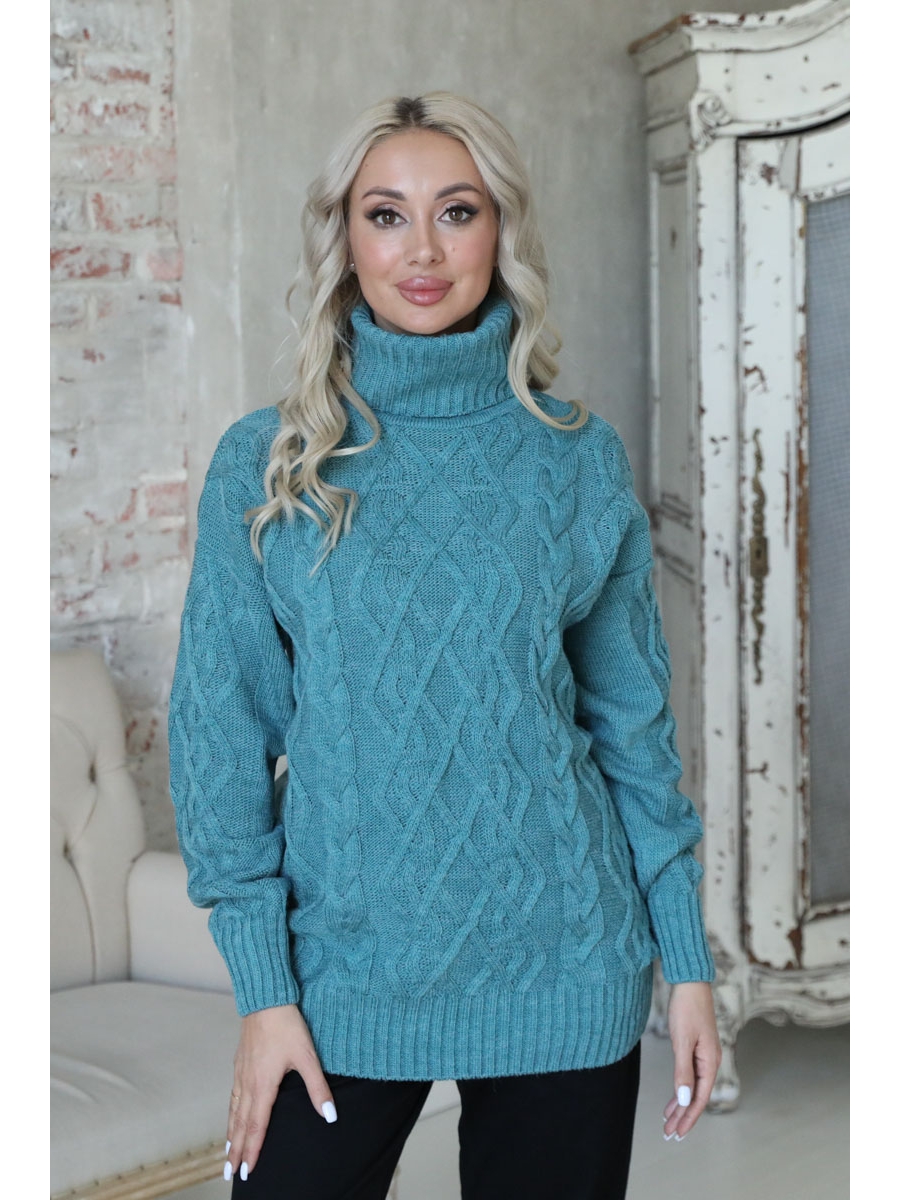 Обворожительный свитер прямого силуэта бирюзового цвета. Свитер выполнен в технике «ручного вязания» из натуральных нитей с содержанием шерсти. Круглый вырез изделия обработан воротником "хомут". Низ спущенных рукавов обработан широкими манжетами. По переду изделия вывязан объемный рисунок. Низ изделия вывязан резинкой.