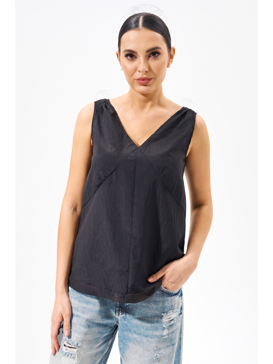 Базовый женский топ свободного силуэта с фигурными линиями по переду и небольшой сборкой по бретелям.