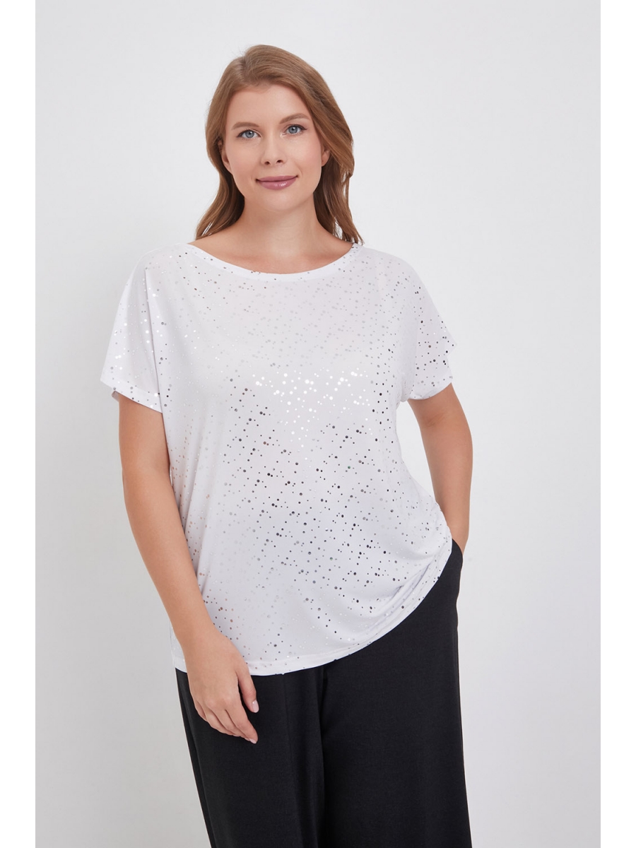 Женский нарядный топ больших размеров выполнен из трикотажного полотна по типу масло с пайетками, приспущенный короткий рукав.
