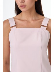 Полуприлегающий силуэт с рельефами по переду и спинке. Широкие бретели с декоративными деталями по переду дополняют образ. Застежка на молнию в среднем шве спинки.