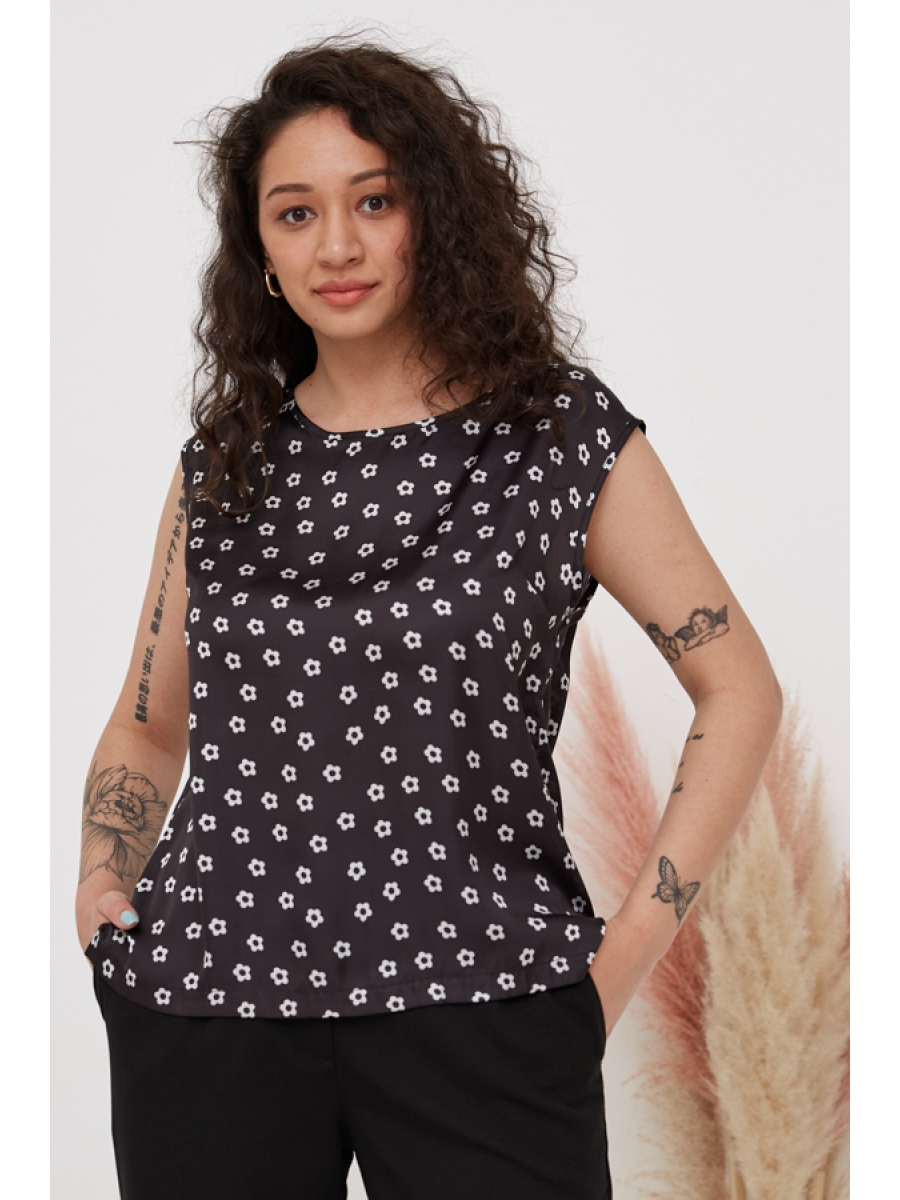 Топ из легкой атласной блузочной ткани. Свободный силуэт, с небольшими разрезами в боковых швах. Круглый вырез горловины и линия проймы окантованы косыми бейками из основной ткани.
