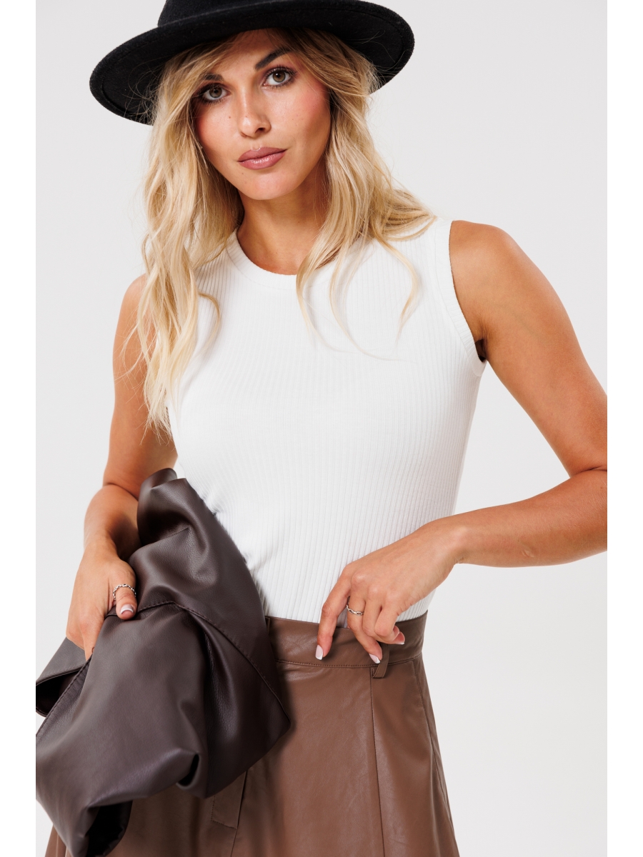 Топ женский полуприлегающего силуэта из трикотажной ткани. Горловина и проймы обработаны бейкой.