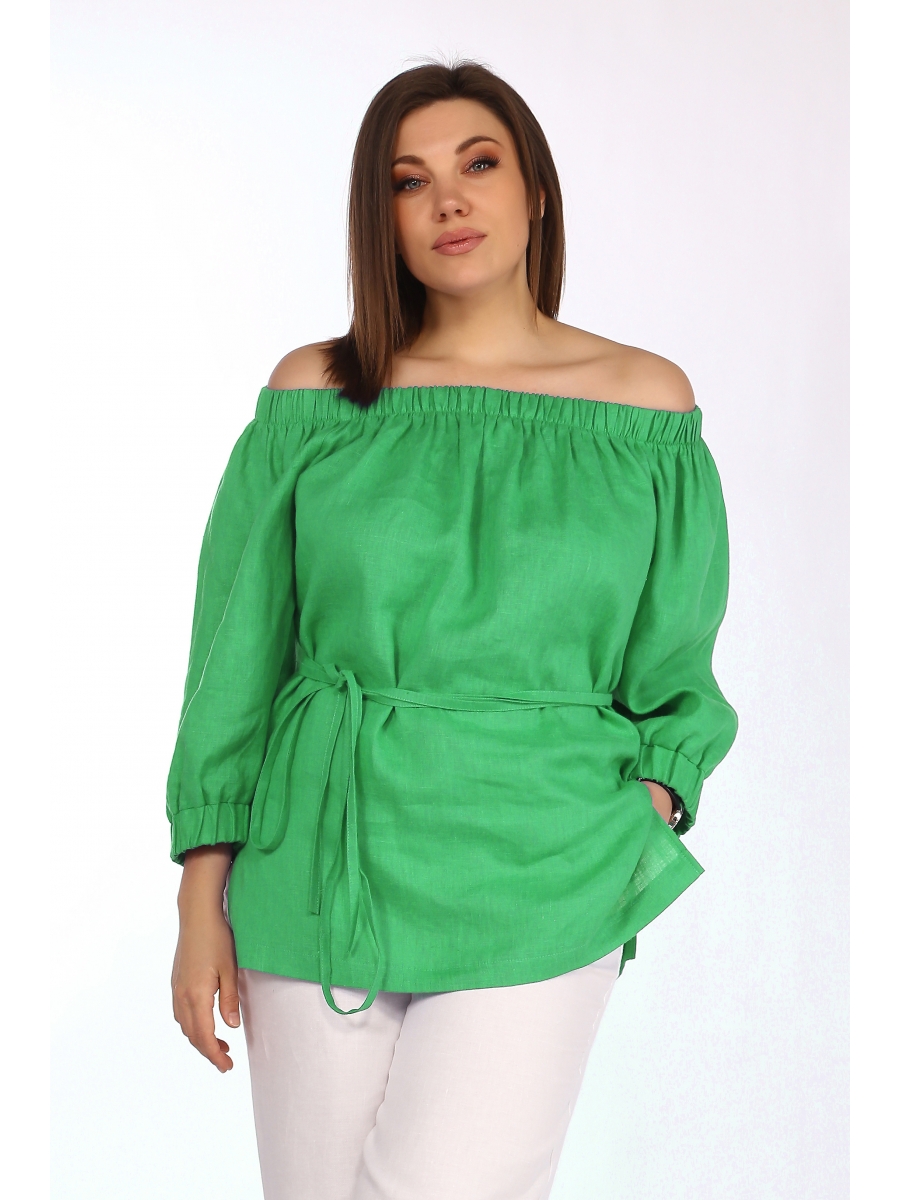 Вырез горловины глубокая лодочка на эластичной сборке, что позволяет менять форму выреза от декольте, до асимметрии. Пояс в комплекте.