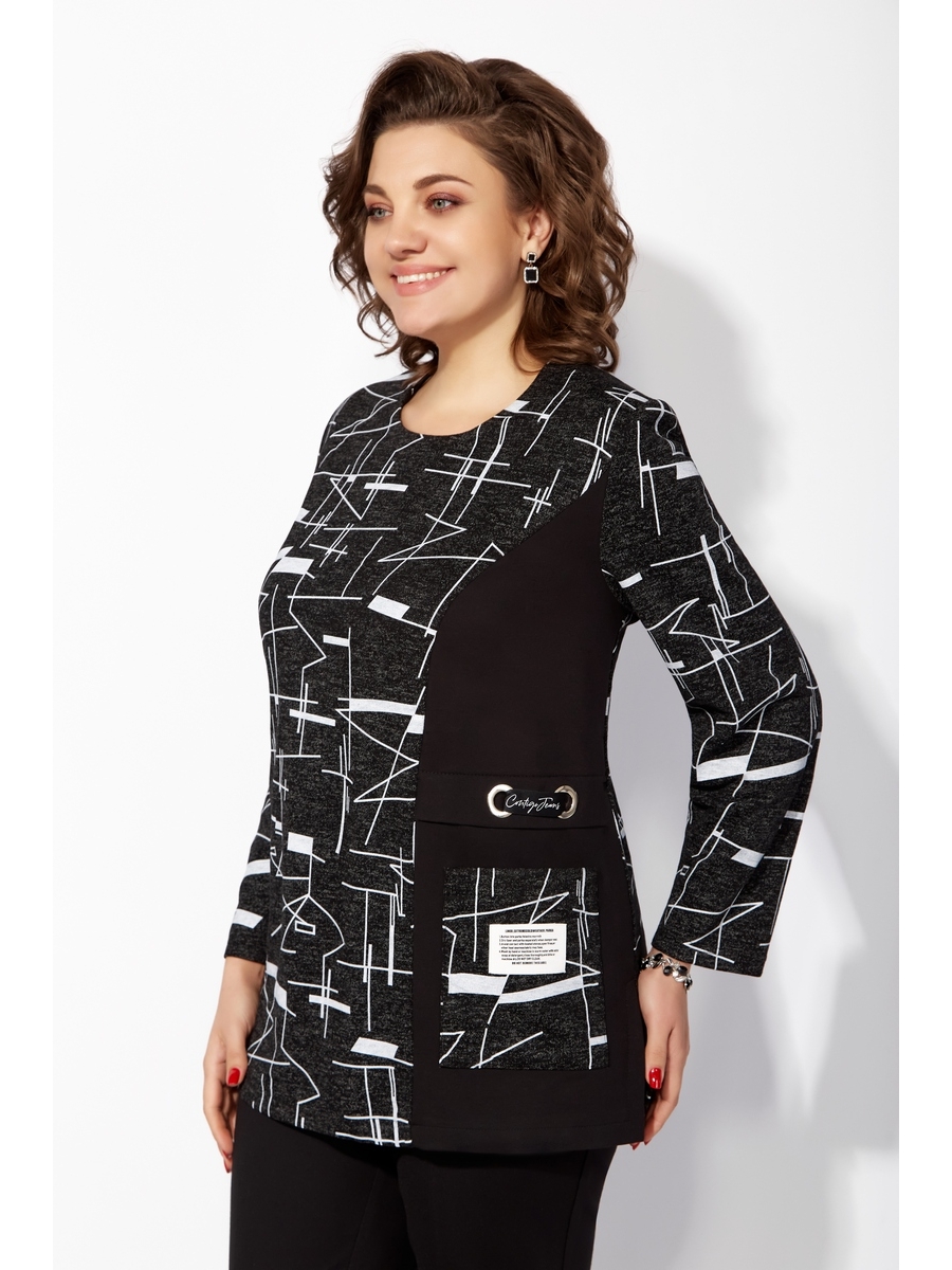 Туника прямого силуэта, изготовленная из мягкого и приятного на ощупь трикотажа, отличается длинами рукавами и округлым вырезом горловины, который нежно обрамляет шею, подчеркивая её линию. Геометрический принт, который украсил однотонную часть ткани, придаёт модели особый шарм и уникальность, создавая интересные визуальные акценты. Этот дизайн не только привлекает внимание, но и эффективно скрывает небольшие недостатки фигуры, создавая иллюзию стройности. Туника легко комбинируется с разными низами, позволяя создавать множество стильных образов.