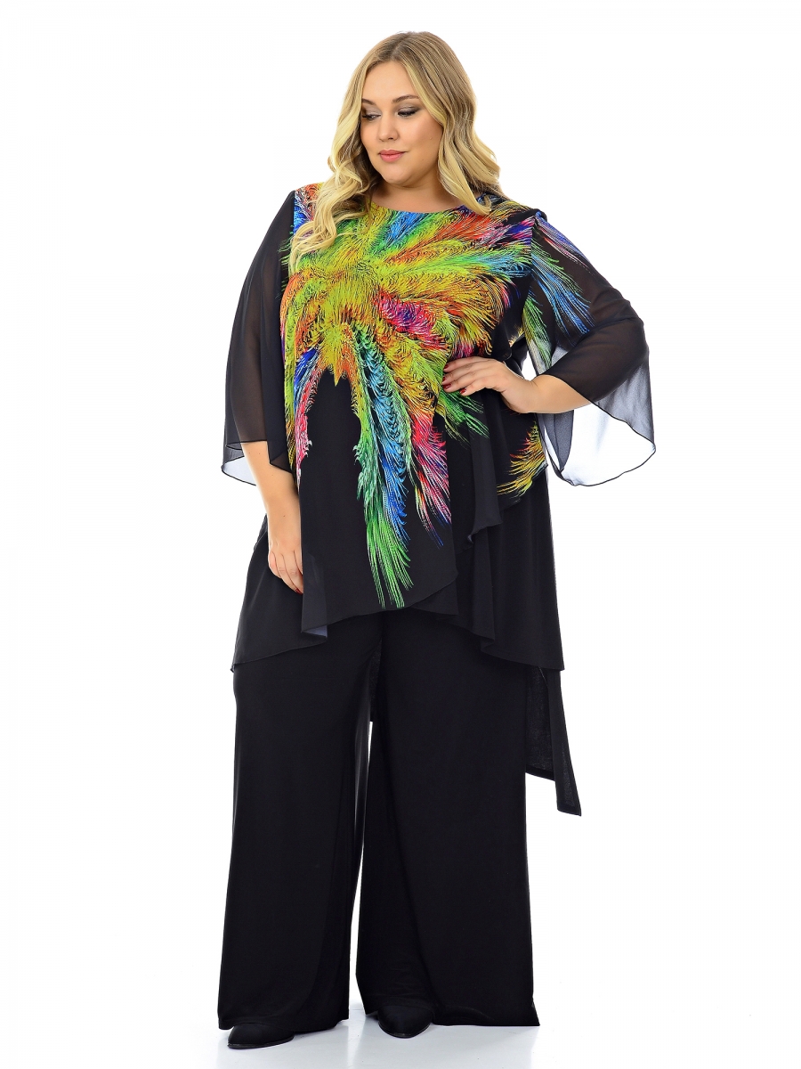 Стильная многоуровневая туника из легкого черного трикотажа, комбинированного с шифоном. Внутренняя часть переда и спинка из трикотажа, верхняя часть переда и рукава из шифона. В боковых швах разрезы. Линия низа асимметричная, рукав расклешенный. Грамотно проработанные разноуровневые вертикали правильно корректируют и зрительно вытягивают силуэт.