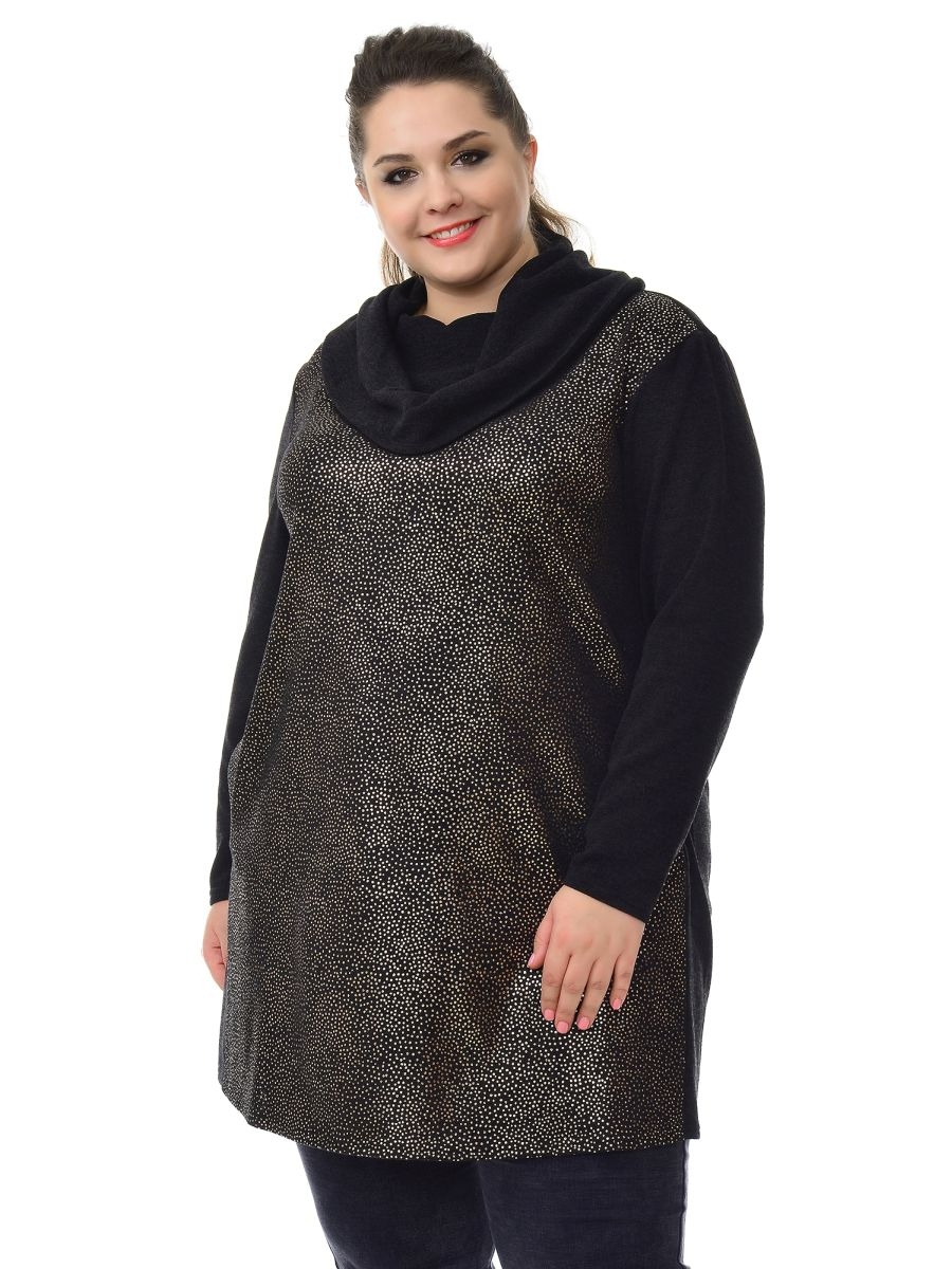 Туника свободного силуэта из искусственной ангоры. Уникальность ее конструкции в отсутствии боковых швов. Спинка переходит в переднюю часть на уровне вертикальных рельефных швов, зрительно вытягивающих силуэт, в этих швах обработаны карманы. Передняя часть туники из ткани с золотым напылением. По горловине воротник - "хомут". Идеально сочетается как с брюками, так и с юбкой.