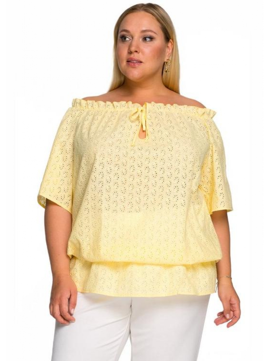 Туника из хлопка-шитья свободного силуэта. Рукав на основе реглан. Линия горловины расширена, на резинке, за счет чего можно приоткрыть плечи. На уровне линии талии напуск, зафиксированный резинкой.