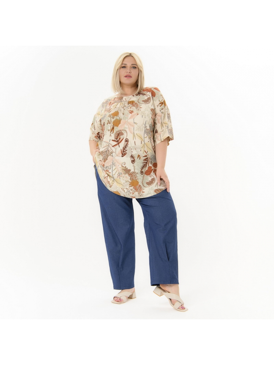 Летняя туника из штапеля свободного силуэта. Горловина на закругленной широкой обтачке. По центру переда из-под обтачки небольшая сборочка, по центру спинки - встречная