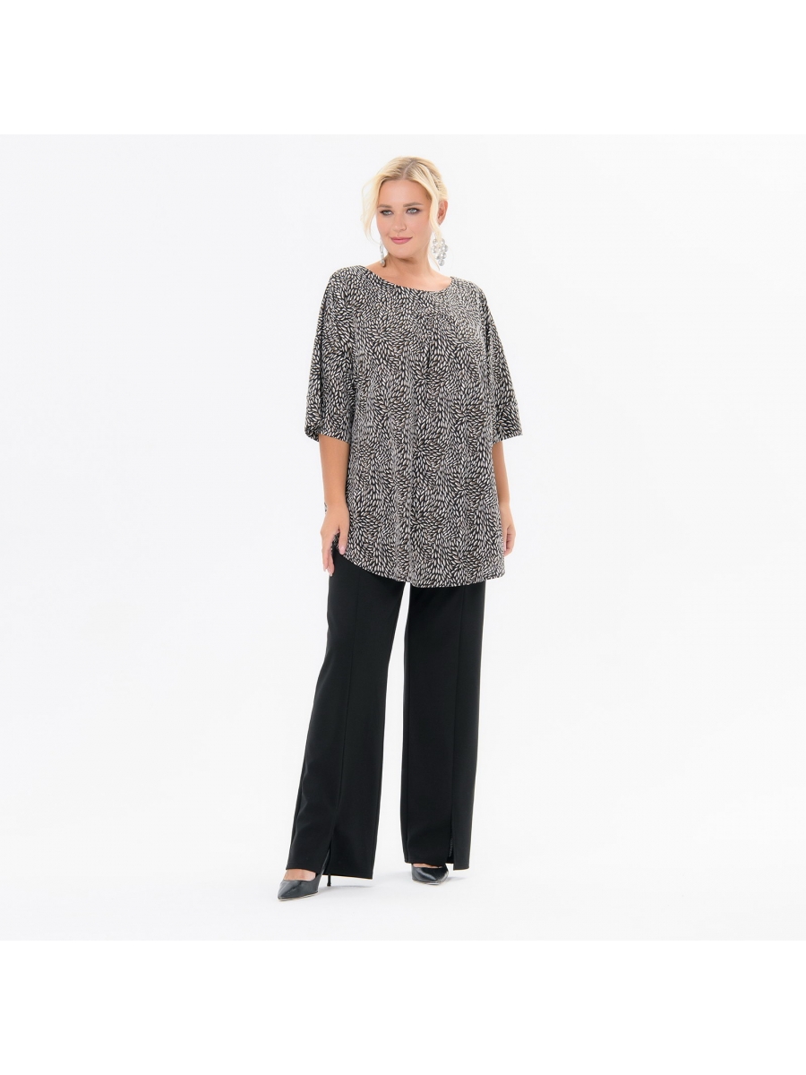 Свободная туника из принтованого трикотажа "масло". Горловина на широкой закругленной обтачке. По центру переда из под кокетки сборочка, по центру спинки встречная складка. Линия плеча спущена, рукав прямой, свободный, с широким манжетом.
