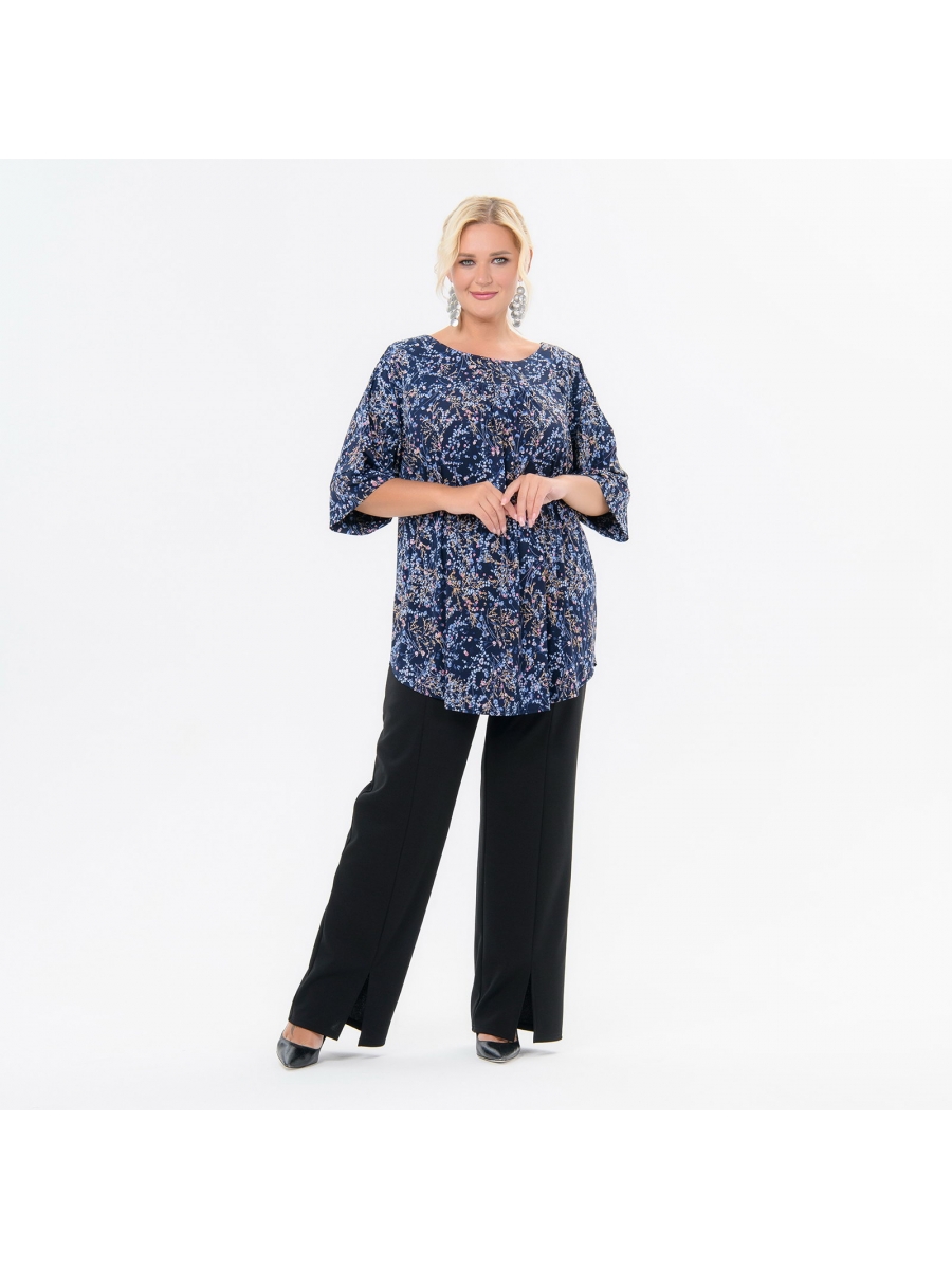 Свободная туника из принтованого трикотажа "масло". Горловина на широкой закругленной обтачке. По центру переда из под кокетки сборочка, по центру спинки встречная складка. Линия плеча спущена, рукав прямой, свободный, с широким манжетом.