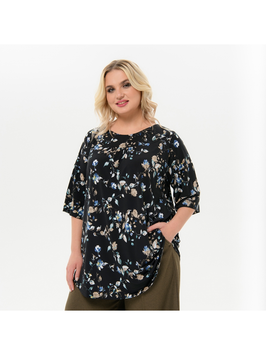 Свободная туника из принтованого трикотажа "масло". Горловина на широкой закругленной обтачке. По центру переда из под кокетки сборочка, по центру спинки встречная складка. Линия плеча спущена, рукав прямой, свободный, с широким манжетом.