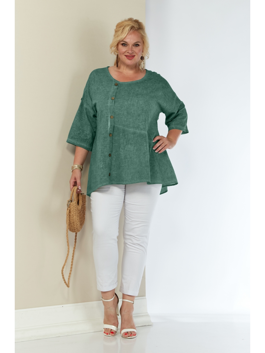Женская льняная туника выполнена из высококачественного умягченного 100% натурального льна. Лён прошёл процедуру энзимного умягчения на производстве, поэтому туника не колется и не садится после стирки. Модель свободного силуэта к низу расширена, за счет подреза и легкой сборки по полочке. Вырез горловины округлой формы. По переду смещенная планка, декорированная пуговицами. Рукав трансформер, со спущенной линией плеча, регулируется при помощи паты и пуговицы. Спинка со средним швом. Низ изделия фигурный.